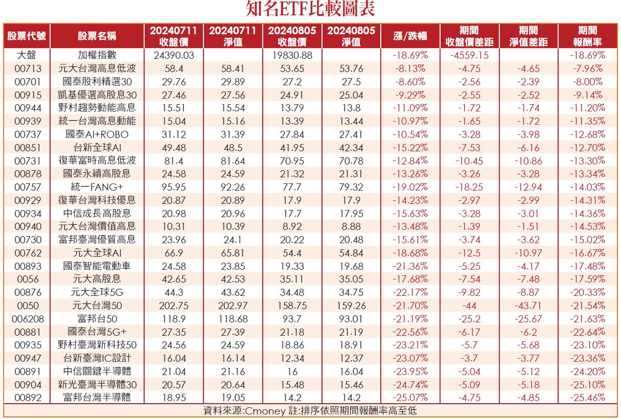 以國內市面上知名、熱門的ETF為例(見表),針對7/11的起跌點和8/5的止跌點分別做價格和淨值上的比較,並計算出期間的報酬率,同時和大盤加權指數做對比,統計出究竟期間中,哪些ETF表現比大盤好,也同時能找出到底哪支ETF的表現符合最大贏家的資格。