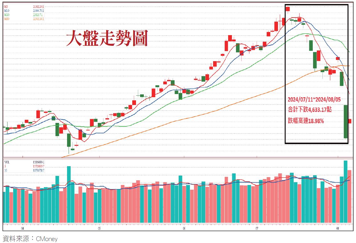台股大盤在2024年7月11日創下歷史最高點後,情勢馬上風雲變色,指數走勢隨即掉頭向下,即使過程中有反彈,也於事無補,一路突破5日線、10日線,一直到8月5日,創下單日史上收盤最大跌點1,807.21點,直接又摜破半年線。此波台股的重挫,一共耗時15個交易日,從最高點到最低點,合計下跌4,633.17點,跌幅高達18.98%,最後才在8月6日的收盤反彈670.14點暫時止跌。