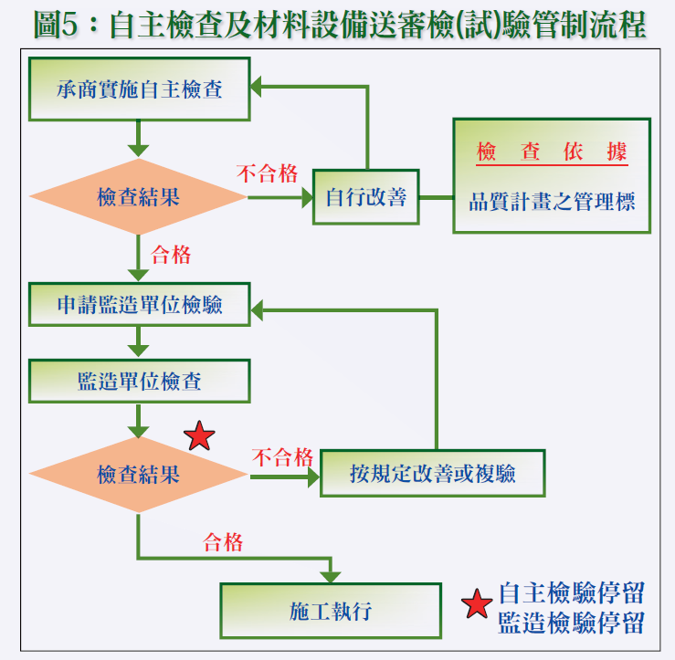 依據施工品質管理作業要點規定,建立管理責任,訂定施工要領、訂定施工品質管理標準、訂定材料及施工檢驗程序、訂定自主檢查表、不合格品管制、矯正與預防措施、內部品質稽核及建立品質紀錄管理系統等。