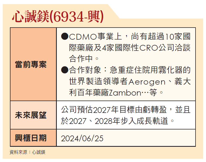 展望未來,以Aerogen合作專案來看,估計全球出貨量將由第一年的一萬台,逐步成長到十萬台;從義大利百年藥廠Zambon專案來看,近期正在爭取FDA核准,並預計於2027至2028年上市。在CDMO事業上,尚有超過10家國際藥廠及4家國際性CRO公司洽談合作中。心誠鎂表示,雖然近期營運波動較大,等到心誠鎂和藥廠合作案進入重大里程碑,目標2027年由虧轉盈,並且於2027、2028年步入成長軌道。