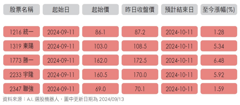 A.I.智慧學習ETF選股機器人9月11日更新名單,至13日短短3個交易日,大盤指數上漲728點,A.I.智慧學習投資組合也表現亮麗,20檔成分股僅安勤(3479)平盤外,其餘均呈現上漲走勢,其中,尤以上櫃電子零組件廠亞泰(4974)上漲12.56元最高。累計今年1~7月,漲幅更高達80%。