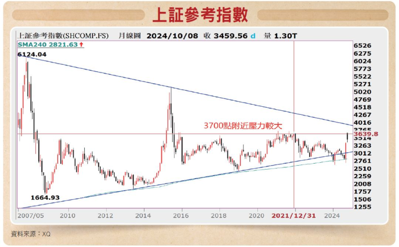 進入2024年第四季,恒生指數漲到約兩年半的22688高點,從9月11日的17108點起漲到10月7日的23241點,+6133漲點、漲幅+35.84%,在銀行與地產股大漲之後,券商、醫藥與半導體股接棒大漲,10月7日在港交所上市的科創50ETF─南方科創板50一度暴漲近30%。