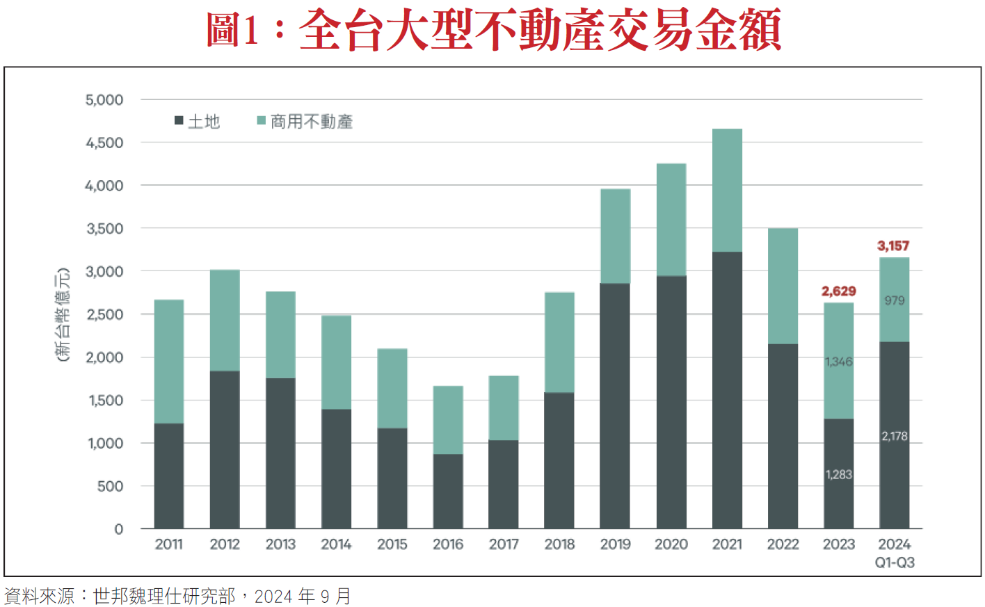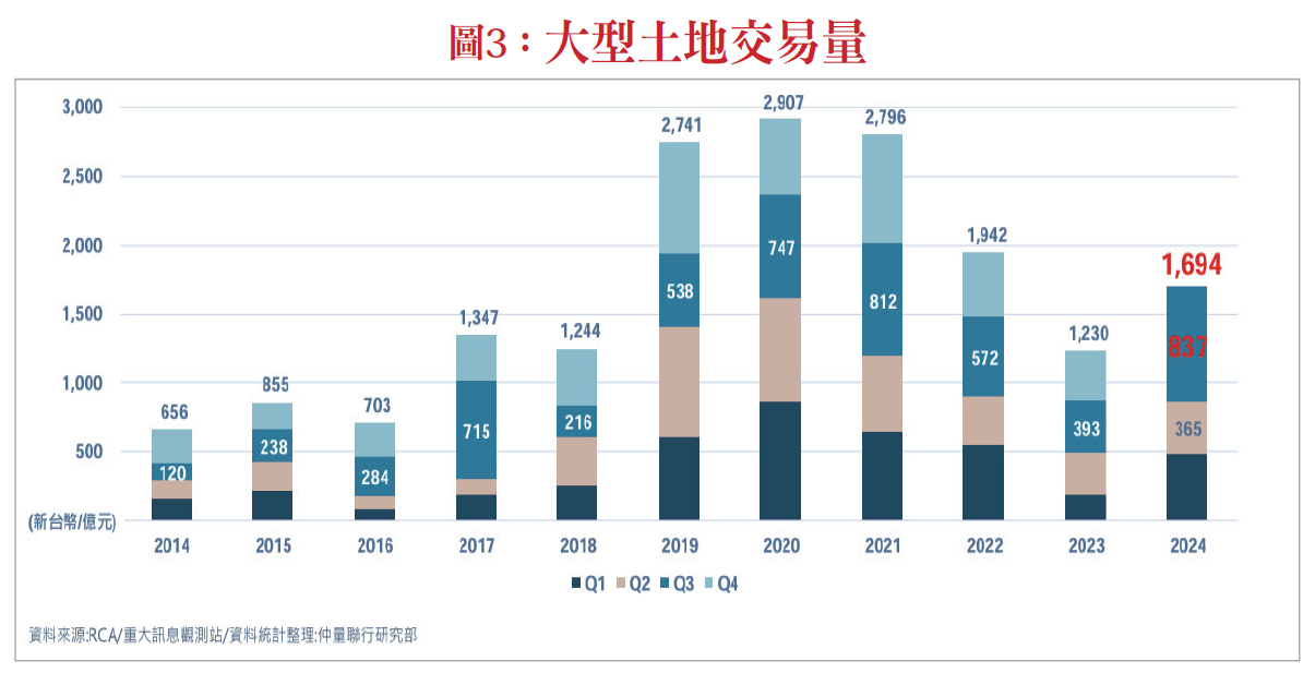 世邦魏理仕研究部主管李嘉玶指出,今年第三季全台土地買賣金額達新台幣1,044億元,較去年同期大增152%,創下有紀錄以來首次出現單季成交量逾千億元。