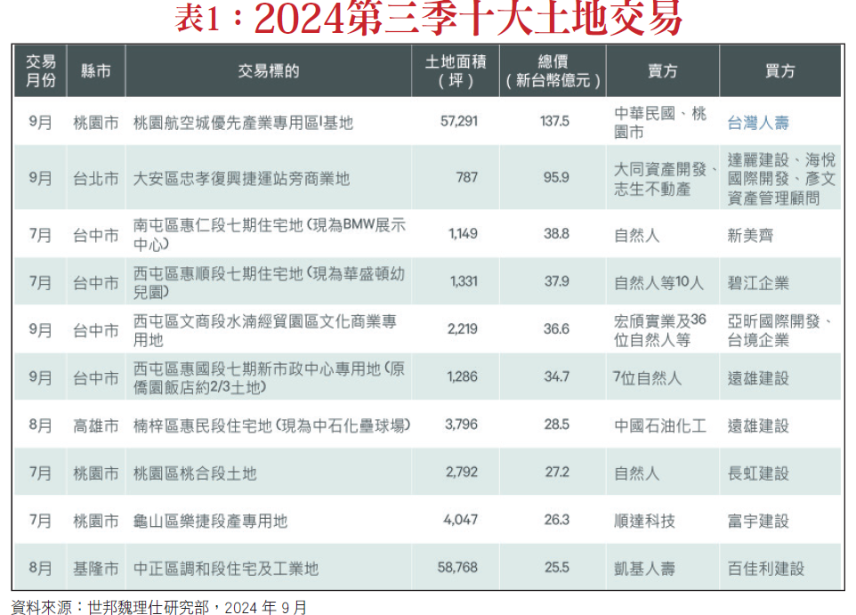 其中,科技大廠、壽險業並列兩大重量級買盤,企業增產擴廠需求強勁,包括台積電就斥資近200億元布局廠房,而久未進場買貨的壽險業者,台灣人壽一出手就是百億元,買下桃園航空城產專區最大基地。
