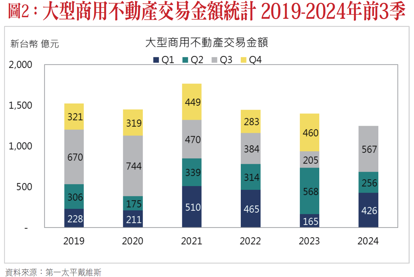 第一太平戴維斯研究部指出,景氣表現升溫以及科技業需求旺盛帶動下,國內商用不動產與土地買氣明顯增溫,第三季大型商用不動產交易金額(單筆3億元以上交易案)達到567億元,季增率達121%,年增率176%。累計前三季交易總金額達1249億元,年增率達33%,成交規模為升息以來新高。