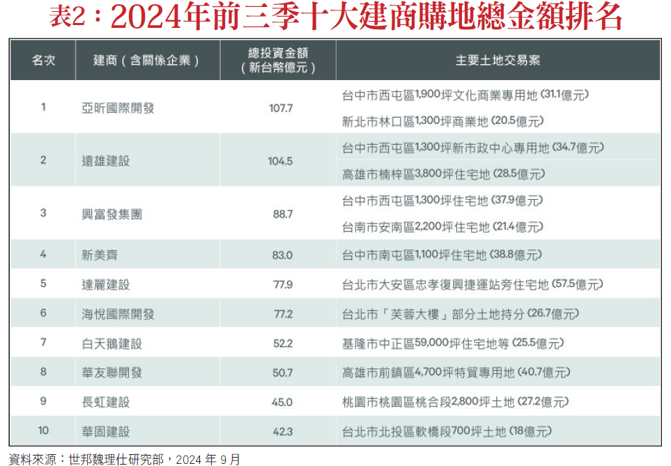 他說,隨半導體相關產業陸續南移設廠,開發商看好未來城市人口增長潛力,高雄和台南在2024年前三季累計大型土地成交量分別達到291億元和136億元,較去年全年已分別增長111%和59%。