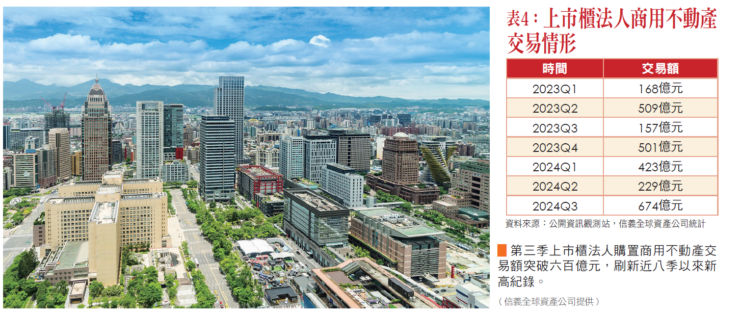 信義全球資產公司也發布商用不動產市場調查,總計第三季上市櫃法人購置商用不動產交易額突破600億元,來到674億元,刷新近八季以來新高紀錄(表四)。