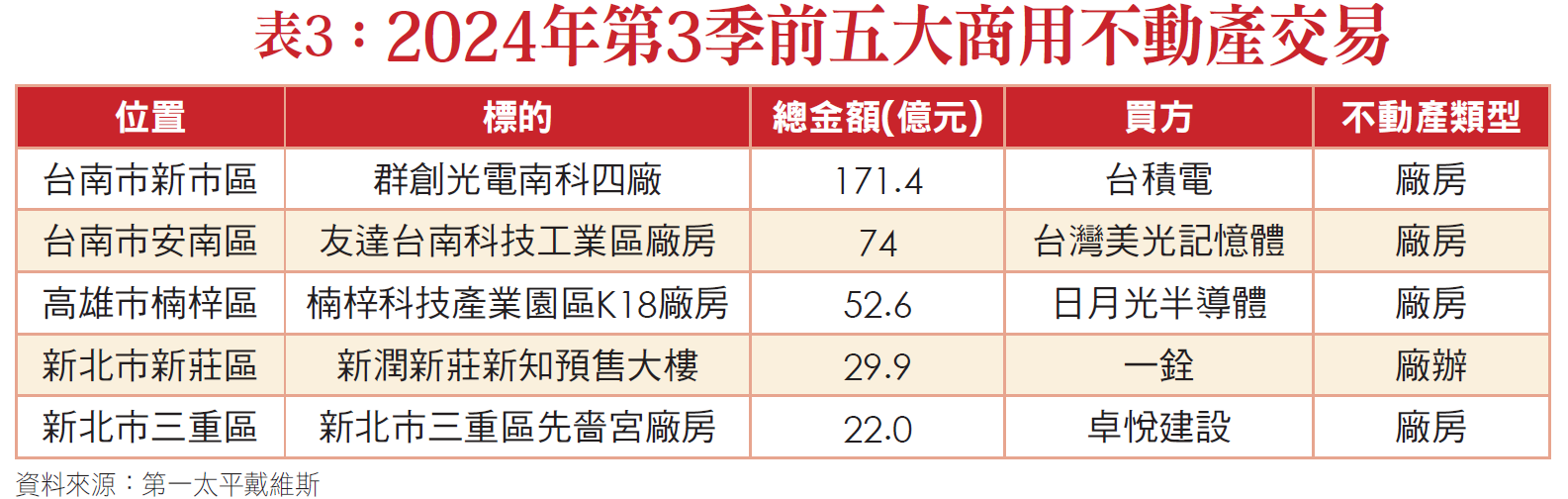 丁玟甄表示,科技業為第三季商用不動產買氣的最大推手,投入總額399億元,占比達七成,本季前五大交易之中,前三筆全由半導體囊括,包括台積電、台灣美光以及日月光半導體等大廠,皆購置廠房擴大在南台灣的產線規模,其中台積電以171億元購入群創南科廠房,成為今年商用不動產最大筆交易(表三)。