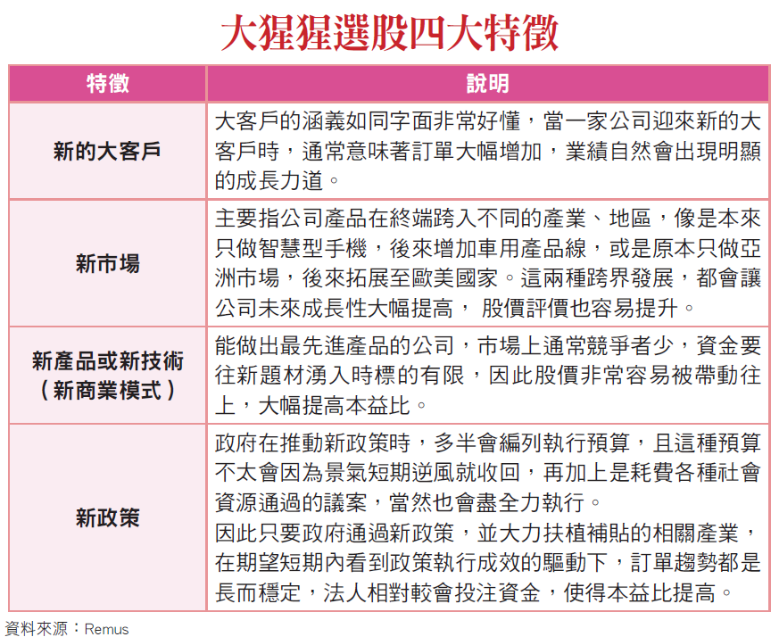 其次,「大猩猩選股法」則從四個特徵來找飆股,包括新客戶、新市場、新產品或新技術、新政策。