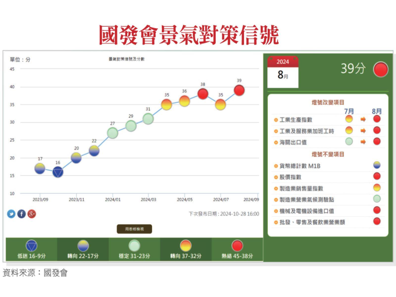 其實景氣燈號是由九個項目所構成,涵蓋了具備領先意義的「M1B」、「股價指數」,但同時也包含了「海關出口值」、「機械及電機設備進口值」等與景氣同步的項目。所以光看景氣燈號,其實並不具備作為預警的效果。若要預警或許可以觀察國發會另一個指標會比較有參考價值些,那就是「領先指標」。它包含「外銷訂單」、「M1B」、「股價指數」、「工業及服務業受僱員工淨進入率」、「建築物開工樓地板面積」、「實質半導體設備進口值」,及「製造業營業氣候測驗點」等七個構成項目組成,可用來預判未來景氣變動。