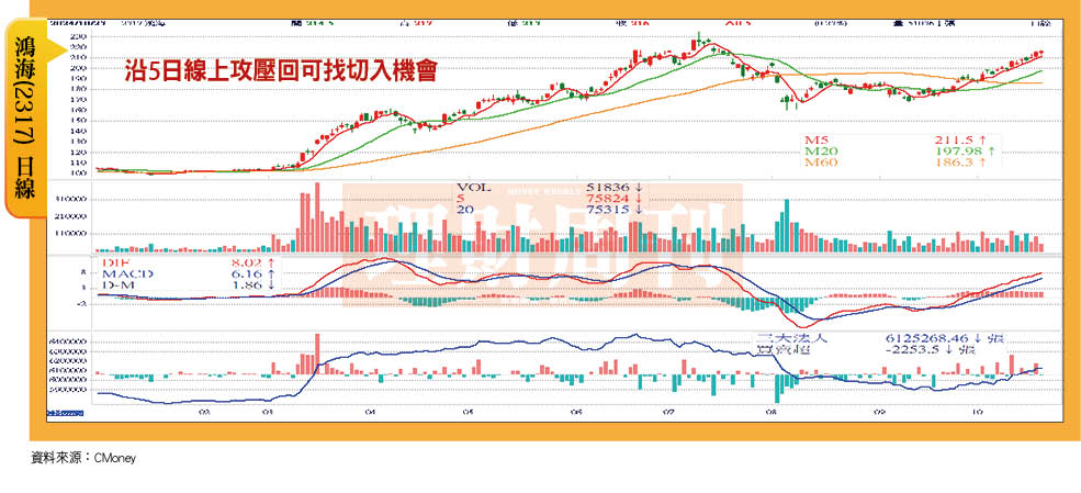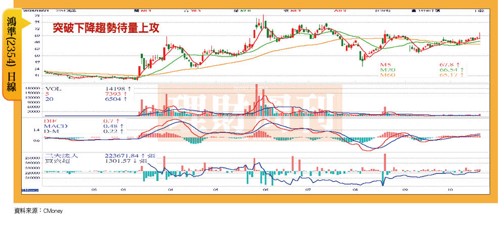 預計第四季營收年增率可望有17%的成長幅度,而市場也一致看好鴻海第四季及明年接續業績的爆發力,自10月起至22日止,鴻海每日的成交均量都在7.2萬張以上,股價上漲共計28元、漲幅達14.93%。後續第三季財報公佈,及在業績題材反映與量能配合下,有機會進一步挑戰7月9日盤中拉上234.5元的歷史高點。
