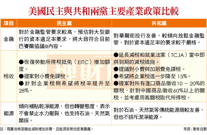 川普的政策對企業主較友善,減稅刺激企業發展,並以關稅作為談判條件,對盟友和貿易夥伴較具競爭性。