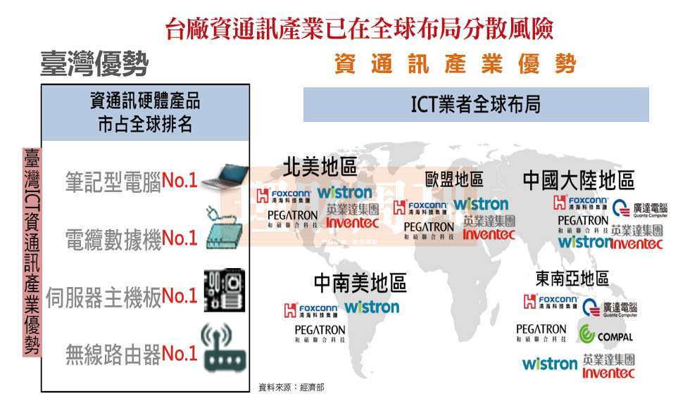 在2018年美中貿易戰開始以來,台灣企業就開始轉移生產基地,不論電子、傳產、科技等領域皆逐漸移出中國,走向全球佈局,這對於台灣企業短期會有相應成本增加,不過長期來看,分散風險的益處遠大於現在和將來的成本。