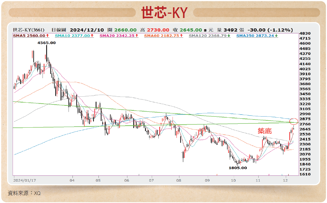 世芯-KY自從聯發科參與私募後,走勢開始轉強向上,2140元以下成為新底部,今年8-9月的2710~2750元高點有機會突破,向上挑戰年線2875元壓力。