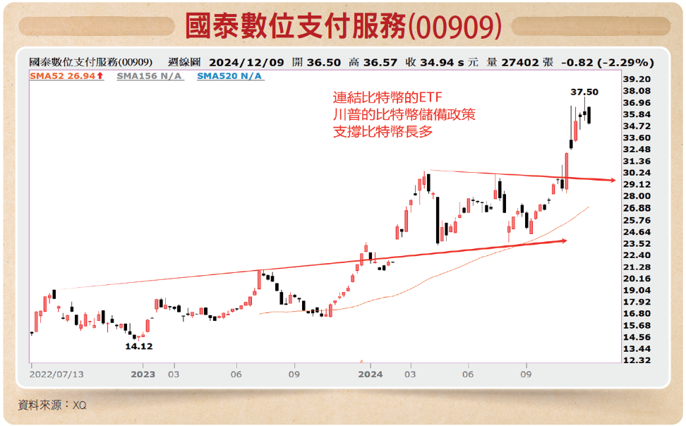 國泰數位支付服務ETF(00909)是目前台股唯一一檔連結比特幣的基金,從8月5日的23.63元漲到12月5日的37.5元,累積58.69%漲幅,自比特幣站上9萬美元、蓄勢挑戰10萬美元的過程,造成國泰數位支付服務ETF以35.83元為中心進行19個交易日的區間震盪,短期來說,似乎要挑戰40元整數關卡的機率不高,多等待觀察。