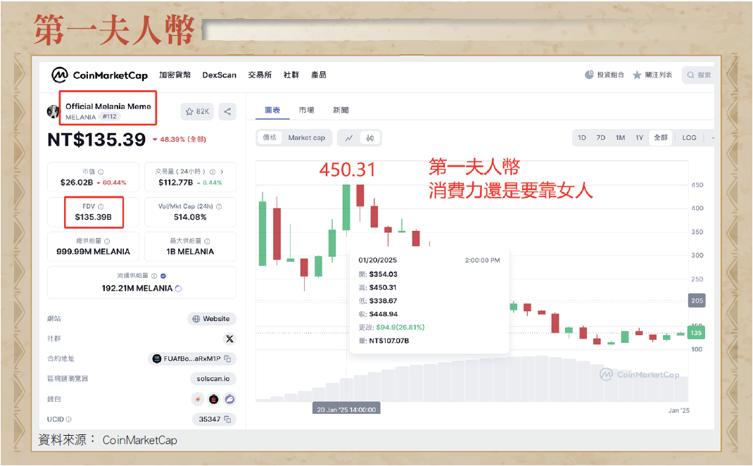 美國第一夫人梅蘭妮亞隔天(1月19日)也推出自己的迷因幣$MELANIA,聲稱它是「對梅蘭妮亞所代表的價值觀的支持和參與的表達」。