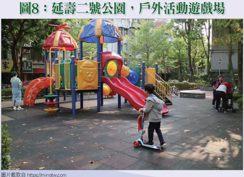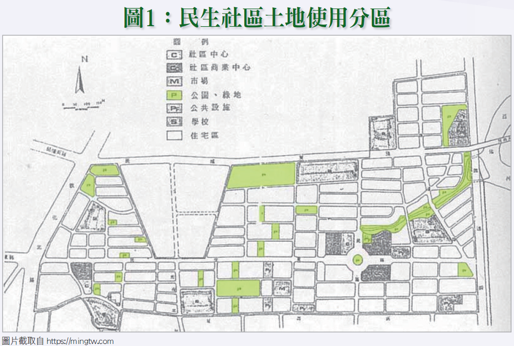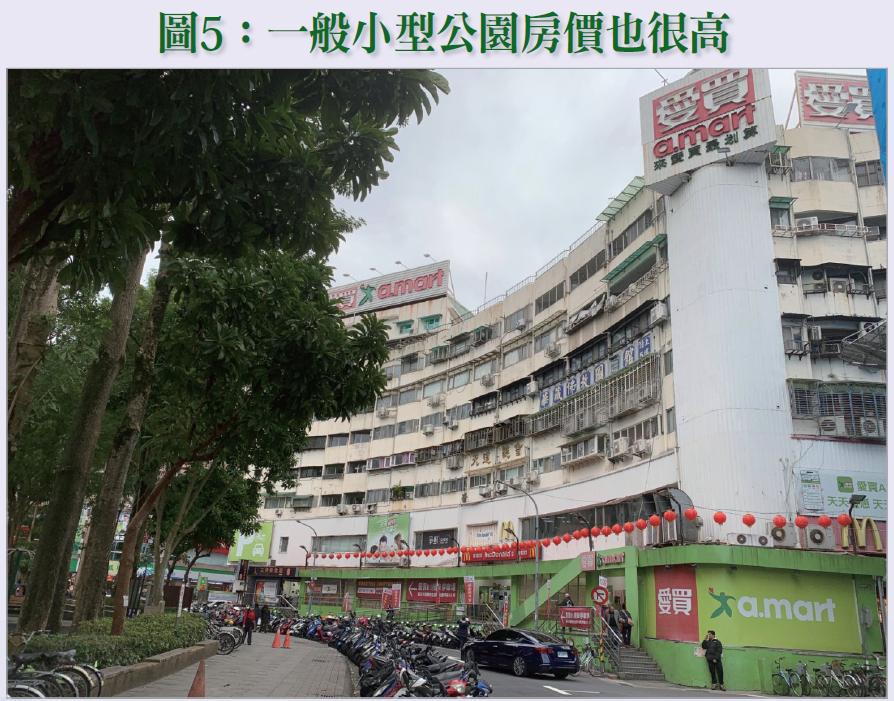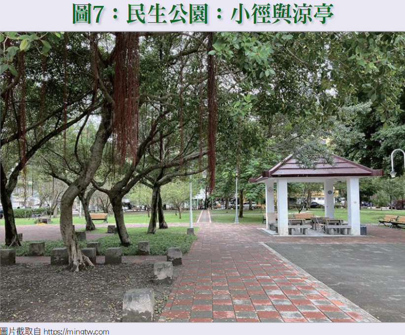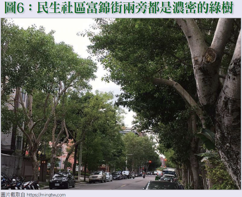 民生社區房價之所以居高不下,主要原因為區內有大小公園25座,合計約11公頃;此外,大街小巷,道路兩旁樹木林立(詳請參閱圖六、圖七、圖八),尤其富錦街的綠色隧道最常為人津津樂道。
