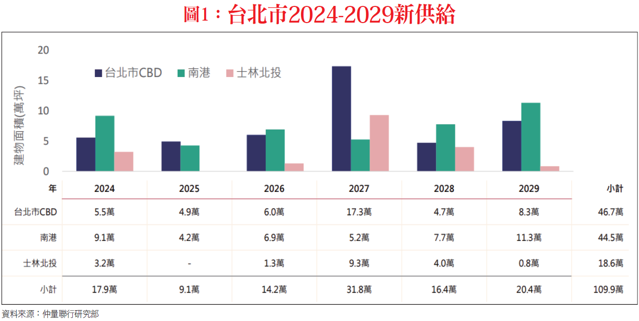 南港商業區於2024年新釋出租賃面積則已去化六成,剩餘庫存約0.7萬坪。2025年,包含除自用、已預租面積,全年釋出面積與庫存總計約7萬坪。由於新供給與現有庫存影響,空置率預計續升至雙位數水平。