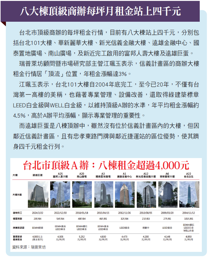 而目前租金最高的仍是信義商圈,每坪每月平均租金達3,355元,不過,他也有觀察到,信義區租金雖仍居高不下,但漲幅自第二季起已趨緩。從等級來看,受到企業升級辦公場所需求,A級大樓平均租金來到2,971元,另在調查的A級大樓樣本中,更有超過三成的大樓月租金超過3,000元。