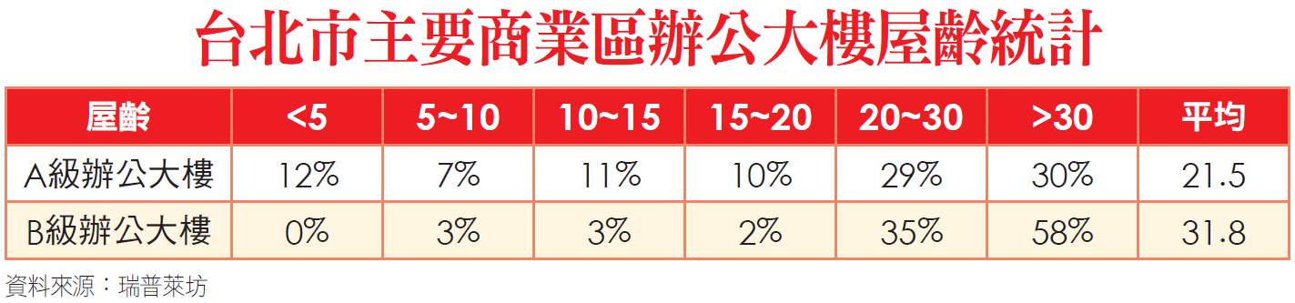 江珮玉指出,依據統計台北市A級辦公大樓平均屋齡為21.5年,且約有三成的大樓屋齡超過30年,B辦平均屋齡為31.8年,屋齡超過30年以上的接近六成(如附表),因此台北市的辦公大樓屋齡偏高。