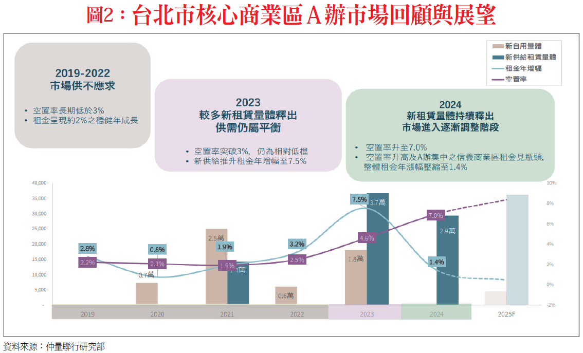 2024年新供給持續釋出,全年空置率攀升至7.0%,加以A辦集中區的信義商業區租金見瓶頸,租金年漲幅則壓縮至1.4%,市場由穩定進入逐漸調整階段。