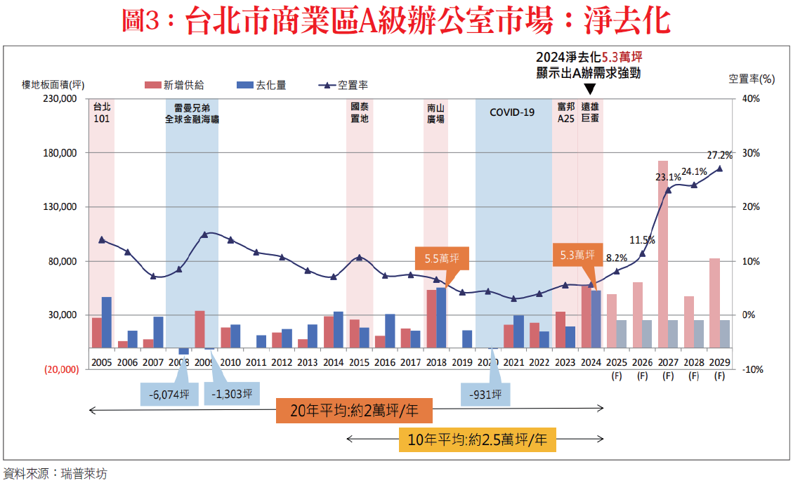 不過,「貴者恆貴」,瑞普萊坊顧問暨市場研究部主管江珮玉表示,台北市A級辦公大樓租金方面,因2024年年淨去化達到5.3萬坪(圖三),為二十年來第二高,高於年平均去化2-2.5萬坪許多,且在幾棟新大樓完工的帶動下,租金持續上漲趨勢,年漲幅為2.8%。