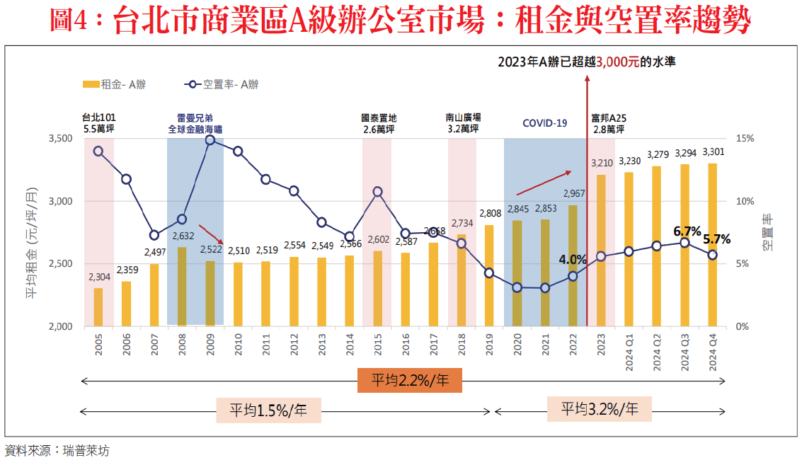江珮玉指出,台北市A級辦公室市場租金行情,在台北101大樓啟用時,約在2304元,但一路上漲,其間雖有2008年美國雷曼兄弟所造成的全球金融海嘯而短暫拉回整理,但自2016年後就一路上漲,並在2023年突破3000元水準,至2024年底來到3300元(圖四)。