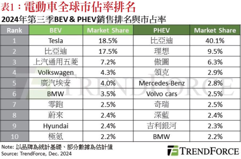 2024年第三季電車全球市佔率統計,在純電車部分,特斯拉占18.5%,而比亞迪為17.5%,僅以1%的差距緊追在後,不過PHEV卻是比亞迪的天下,整體市占率高達4成,後面全部車廠加起來的PHEV市占率還不及比亞迪一家。