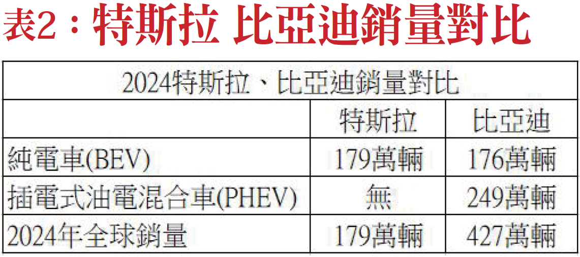 中國品牌比亞迪的崛起,直接影響特斯拉電動車一哥的地位。攤開兩家車廠在2024年Q3的財報數據,特斯拉一共銷售179萬輛,比亞迪純電車的銷售176萬輛,僅差3萬輛就能超車特斯拉。不過,比亞迪還有銷售插電式油電混合車PHEV,若加上PHEV,比亞迪總銷量達到249萬,遠遠領先特斯拉。