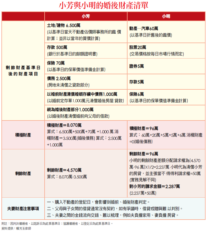 但這時又要認識「婚前財產」及「婚後財產」,賴芳玉說,「婚後財產」的計算,並不是以婚後財產的總額扣除婚前財產的總額,而是確認婚後增加了哪些財產,如果沒辦法證明是婚前的財產,就會被認定為婚後的財產。