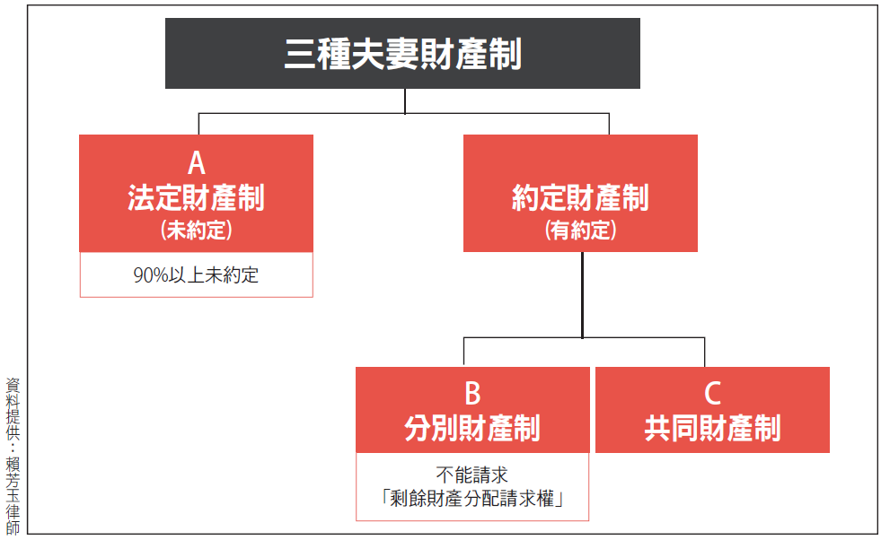 這時,先來認識夫妻的三種財產制度,賴芳玉表示,現行的夫妻財產制分三種(如附圖)。
