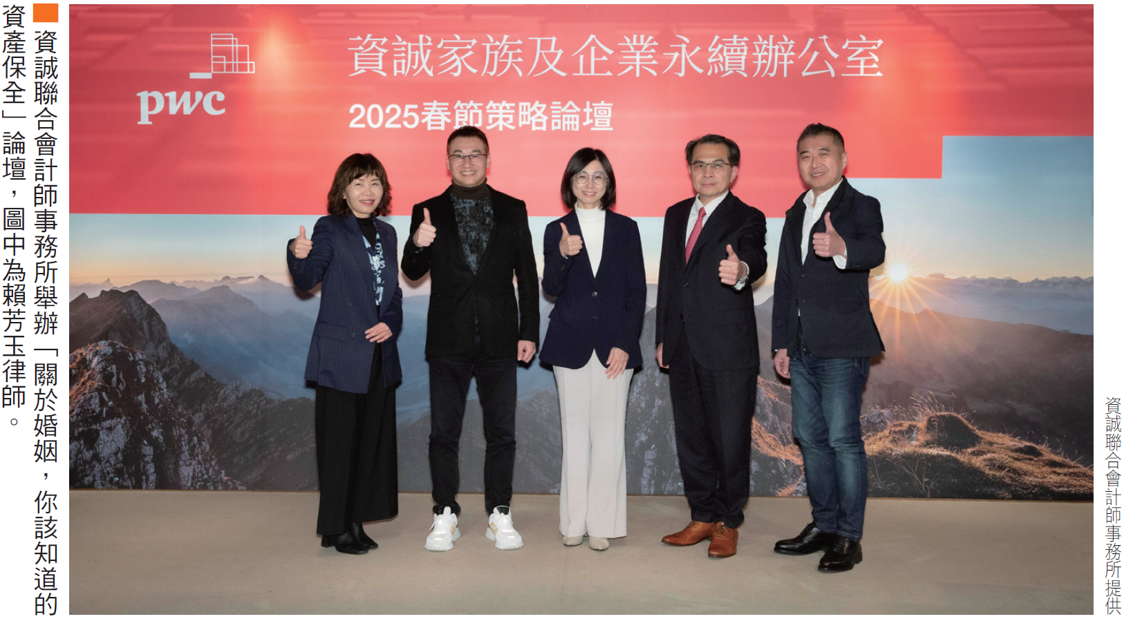 有鑑於此,資誠聯合會計師事務所日前舉辦「關於婚姻,你該知道的資產保全」論壇,由普華商務法律事務所家事與高齡權益服務主持律師賴芳玉、資誠家族及企業永續辦公室主持會計師洪連盛、資誠家族及企業永續辦公室協同主持律師鄭策允,共同探討婚姻關係常見的資產保全方式,並出版了《資誠家族及企業永續辦公室2025春節策略專刊》,特別邀請賴芳玉律師實務分享「關於婚姻,你該早點知道的事」。