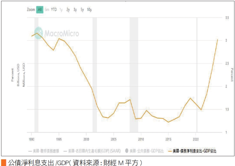 美國目前債務總額為36兆美元,民眾持有的債務約29兆美元,美國債務償還成本每年已超過1兆美元(約33兆台幣),遠超過國防開支,財政赤字不堪負荷,所以川普希望透過降息來減輕債息支出。