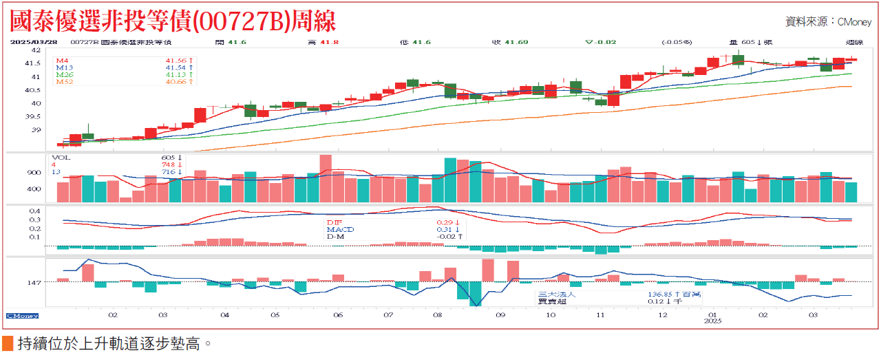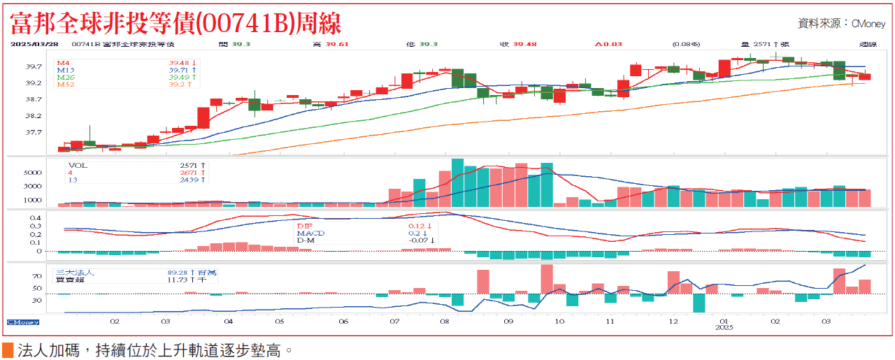 市場法人表示,配置非投等債ETF有助一次滿足投資者對於資產品質、穩健收益與搶攻資本利得等需求。展望後市,殖利率仍具吸引力,資金有望持續流入債市,而市場也偏好鎖定高利率的券種,投資人可把握相關債券ETF投資契機。