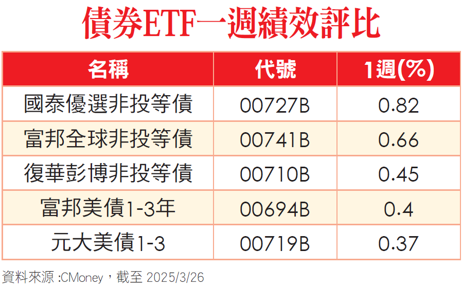 聯準會已表態不會加速降息,但股市的波動仍讓投資人開始避險,將資金移往債市,債券價格走高,殖利率走低,而觀察近一週債券ETF績效表現,又以國泰優選非投等債(00727B)、富邦全球非投等債(00741B)、復華彭博非投等債(00710B)表現最突出。