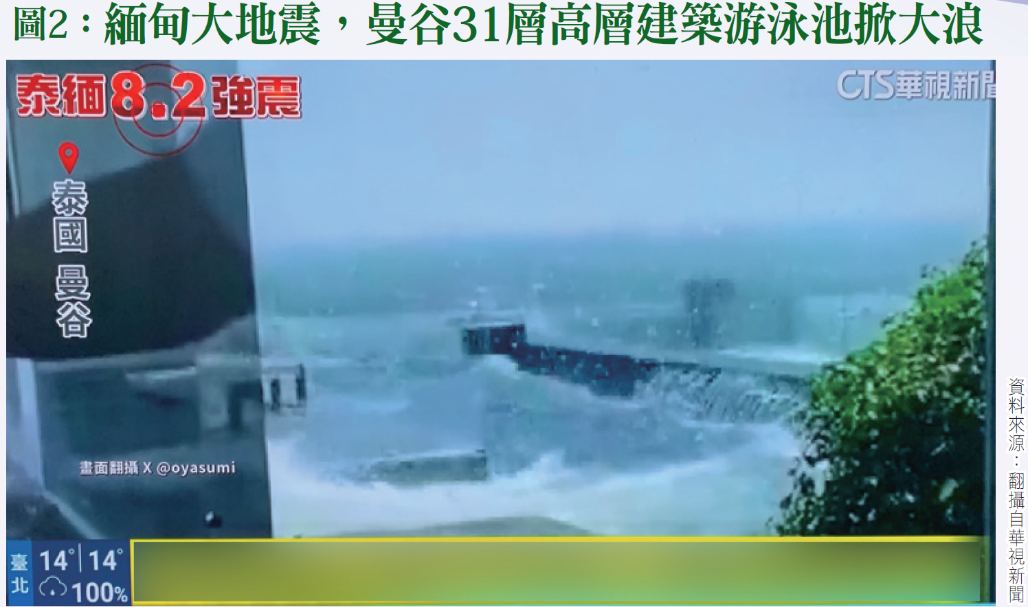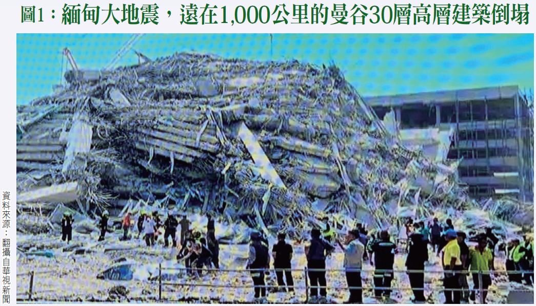 3月28日緬甸發生芮氏規模7.7的大地震,造成距離震央超過1000公里的泰國首都曼谷一棟尚未完工的30層高層建築被夷為平地(詳請參閱附圖一、二、三)。