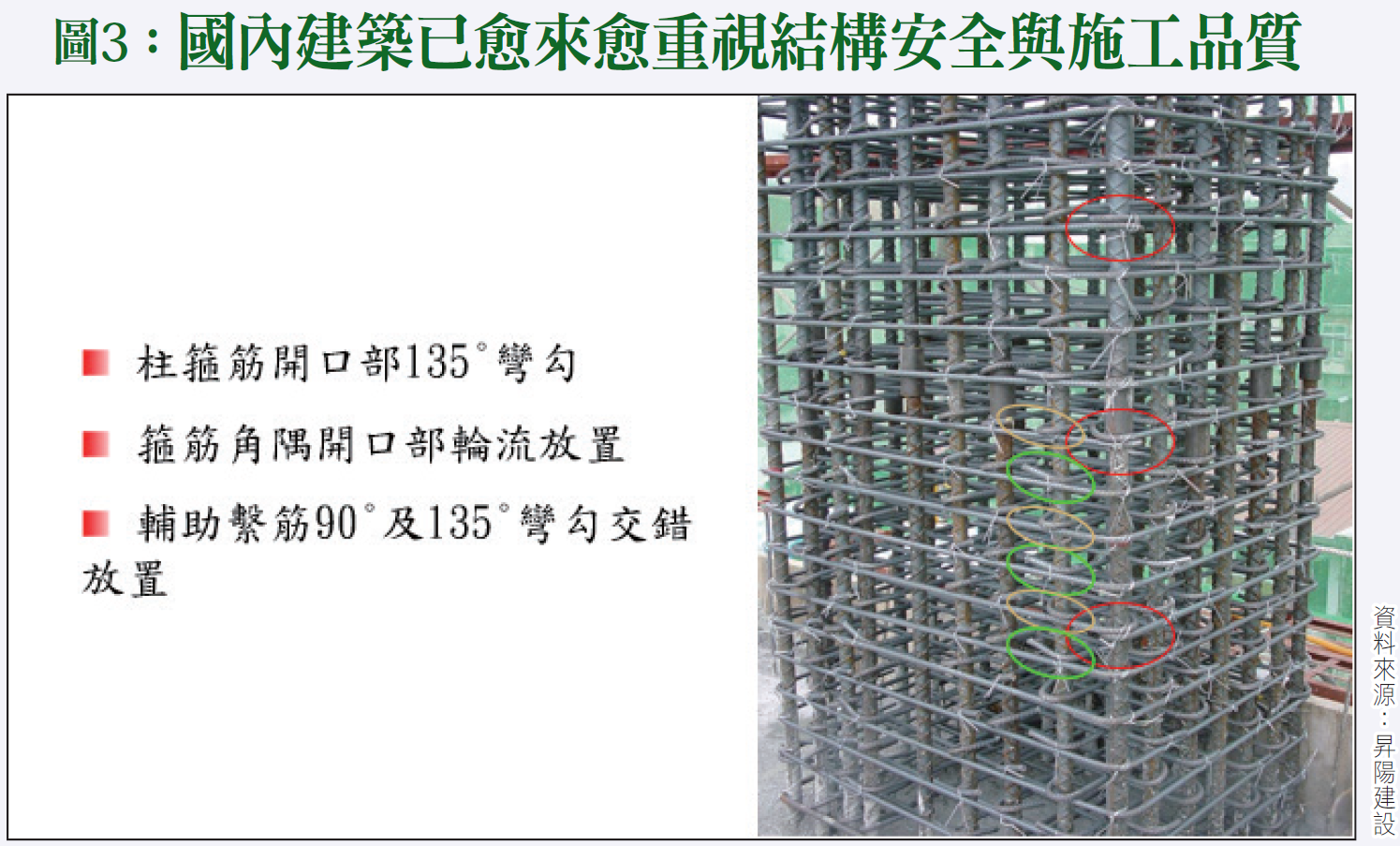 台灣位處地震帶,歷經多次強震經驗,目前各大小建案都已愈來愈重視綑綁主筋的箍筋間距、彎鉤角度、彎鉤長度、箍筋粗細等相關細節。