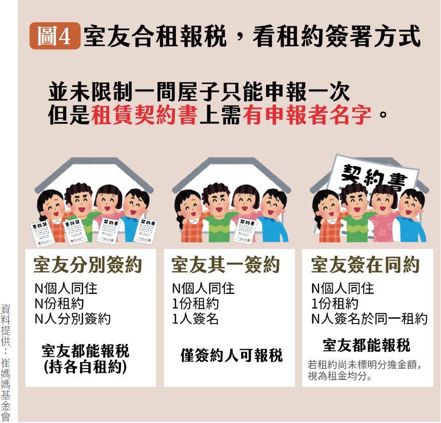 但情況會是一、室友分別簽約:多名室友各自與房東簽約,可憑各自租約報稅。二、室友其一簽約;僅其中一室友有與房東簽約,僅簽約者可報稅。三、室友簽在同約:租約上載明所有室友名稱,可憑租約各自報稅。若未載明各自負擔租金金額,一般推定為均分。