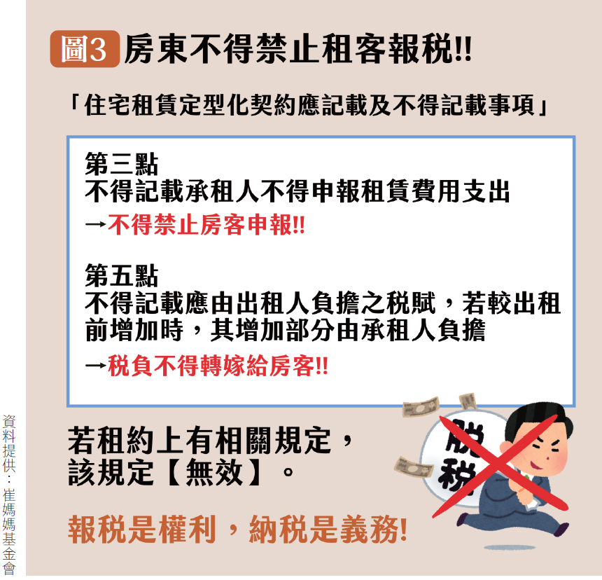 崔媽媽基金會另外呼籲,目前政府的租屋政策,房東不得禁止租客報稅,租約上若有「禁止申報」,還是「轉嫁稅負」的相關規定,是違法且無效(圖三)。