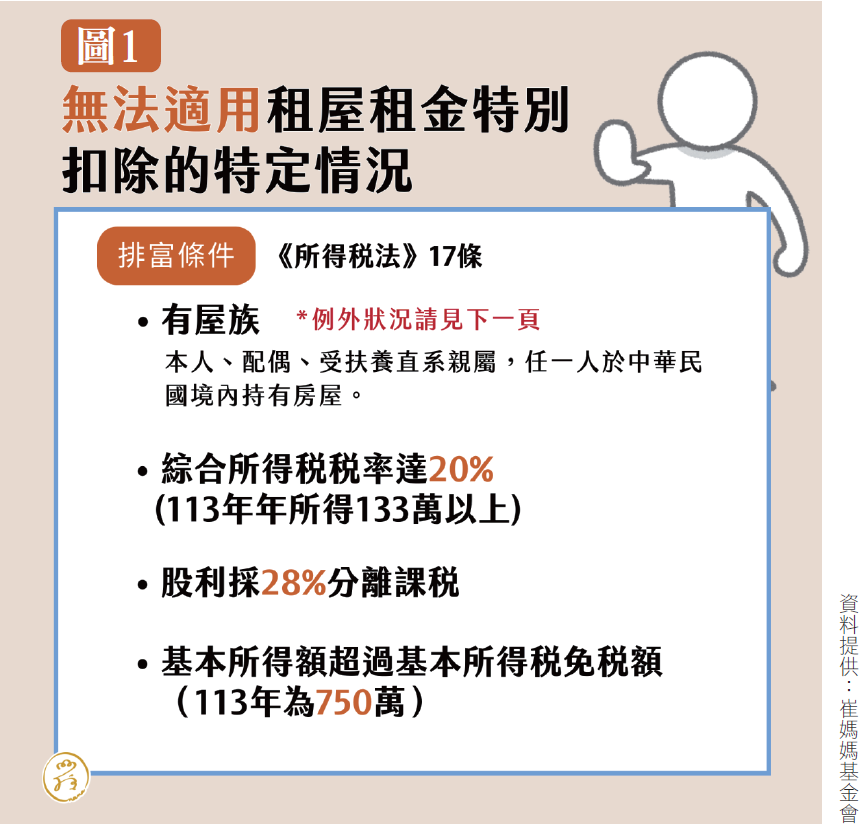 但也有無法適用租屋租金特別扣除的特定情況,也就是政府訂有「排富條款」,根據《所得稅法》第17條,納稅義務人有下列情形之一者,不適用房屋租金支出特別扣除之規定(圖一):