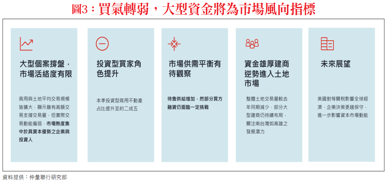 關稅政策亦衝擊全球股市,企業市值縮水進一步抑制資金市場動能,影響台灣上市櫃企業自用型不動產的購置意願。