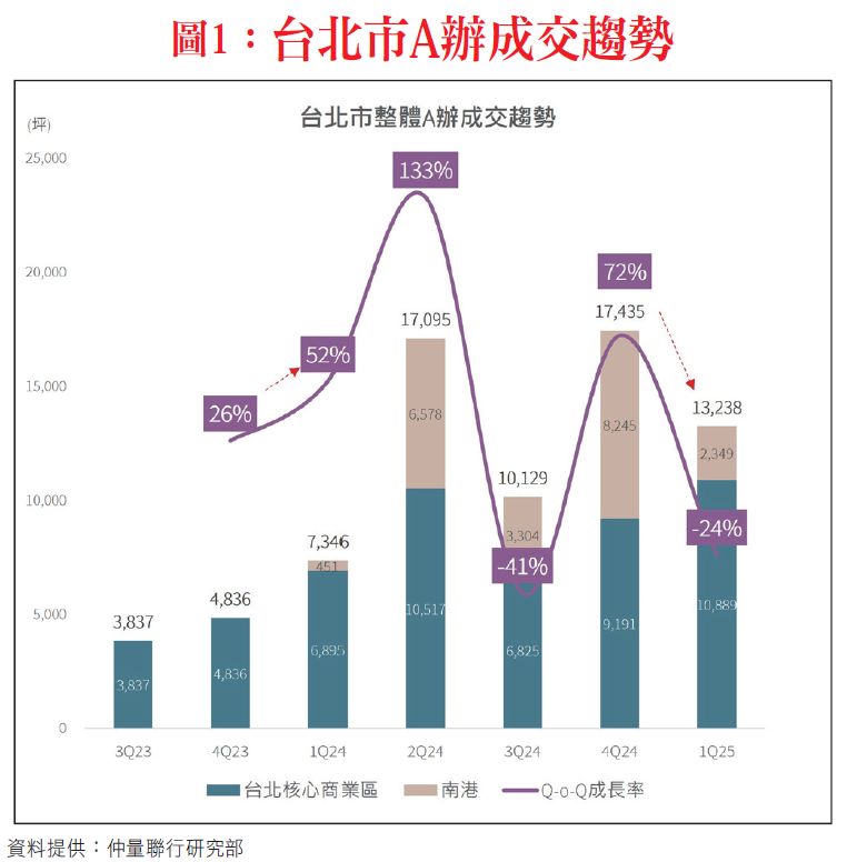 至於台北市商辦租賃市場表現,仲量聯行商業不動產部副總經理游淑芬指出,台北市A級辦公市場,今年第一季租賃成交量為13,238坪,台北核心商業區則為10,889坪,南港商業區為2,349坪,雖然整體A辦成交量體較去年同期成長,但較上一季下降24%;至於核心商業區則較上季成長18%(圖一)。