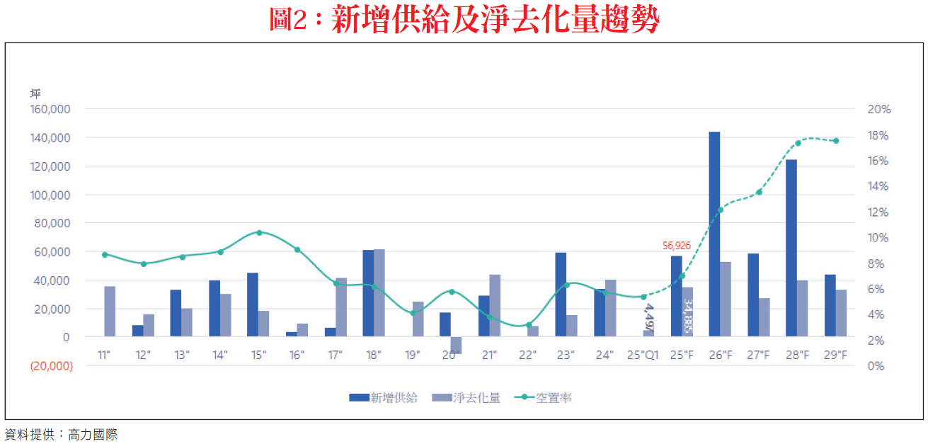 此外,根據高力國際最新統計,2025年第一季辦公室空置率約5.42%,較去年底的5.74%微降。不過第二季後,預估新增供給將陸續入市,總計全年累積約5.7萬坪,近十年僅次於2018年的6.1萬坪,與2023年的5.9萬坪(圖二)。