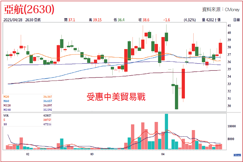 亞航以內需供給為主,又是軍工概念股,近期中小型股因關稅衝擊倒成一片,亞航股價仍站上季線之上,三月營收5.5億元,創近十二個月以來新高,月成長率79.95%。
