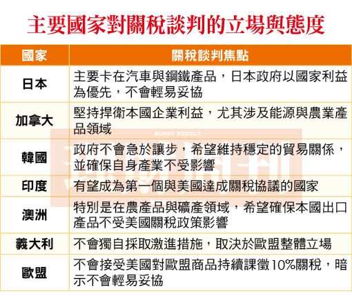 整理主要國家對關稅談判的立場與態度。日本與美國的關稅談判主要卡在汽車與鋼鐵產品上,美方希望降低關稅,但日方強烈反對,並要求美國重新檢視一系列措施。日本政府認為,貿易談判應該以國家利益為優先,不會輕易妥協。