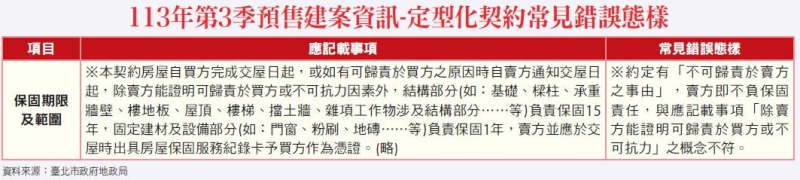 以下謹再就買賣契約書範本與應記載及不得記載事項之保固期限及範圍,再彙整對照113Q3台北市地政局備查時合格率最低之「保固期限及範圍」之錯誤態樣分別提供購屋應注意事項,以供參考。