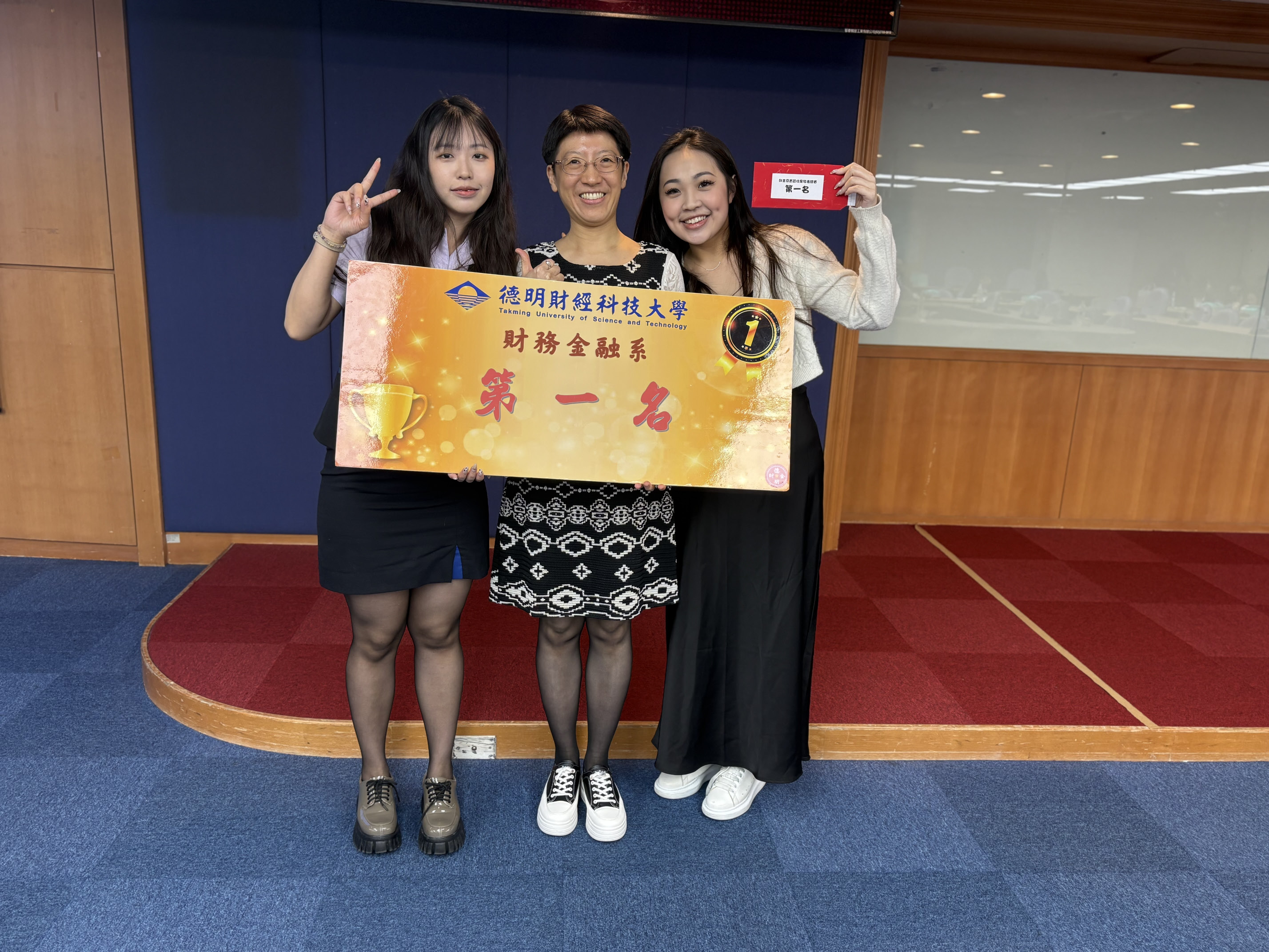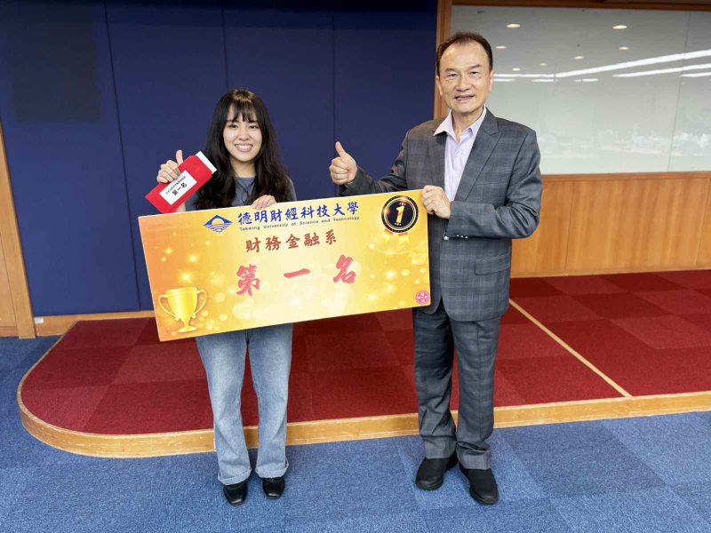 ▲ 財務金融系主任林丹(中)頒發實習成績團體獎第一名。