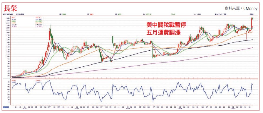 AI很好,但貨櫃輪更棒!5月12日,中國商務部發布《中美日內瓦經貿會談聯合聲明》,中美各取消了共計91%的加徵關稅,暫停實施24%的反制關稅90天。5月12-16日當周,長榮累積漲幅23.46%、萬海+28.18%、陽明+16.99%。