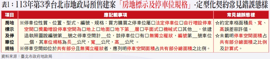 以下謹再就買賣契約書範本與應記載及不得記載事項之保固期限及範圍,再彙整對照113Q3台北市地政局備查時合格率最低之「房地標示及停車位規格」之錯誤態樣分別提供購屋應注意事項,以供參考。