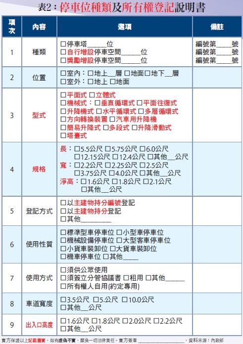 1.買方購買之停車位屬□法定停車位□自行增設停車空間□獎勵增設停車空間為□地上□地面□地下第__層□平面式□機械式□其他__,依建造執 照圖說編號第__號之停車空間計__位,該停車位□有□無獨立權狀,編號第__號車位__個,其車位規格為長__公尺,寬__公尺,高__公尺。另含車道及其他必要空間,面積共計__平方公尺(__坪),如停車空間位於共有部分且無獨立權狀者,其面積應按車位(格)數量、型式種類、車位大小、位置、使用性質或其他與停車空間有關之因素,依第二目之比例計算之(計算方式如附表所示)。(建造執照核准之該層停車空間平面圖影本如附件)。